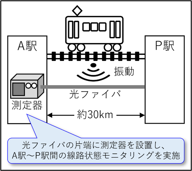 線路沿いに敷設された通信用光ファイバを振動センサーとして活用することで、新たな設備投資を抑えつつ、広域かつ高精度な鉄道設備や周辺環境の常時モニタリングを実現します。