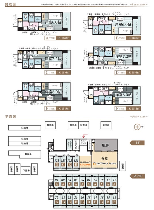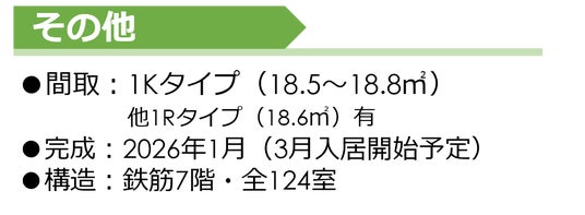 ■総戸数:124戸 1Kタイプ(18.5平方メートル ~18.8平方メートル ) 他1Rタイプ(18.6平方メートル )
