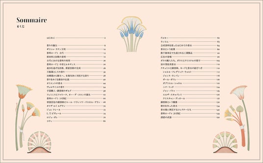 はじめに/香りの誕生/ギリシャ・ラテン文明/香料ロード1 古代/原材料と初期の香料/古代における香料の利用/香料ロード2 中世とルネサンス/進歩を遂げる技術、蒸留技術の完成/万能薬としての香り/治療薬から衛生へ、有毒気体に対抗する香り/香りをめぐる最初の伝説/ヴェルサイユの香り/香料ロード3 19世紀/ガラス職人たち、ガラスとクリスタルの間で/クチュリエと調香師、モードと香水の結びつき/調香師という職業/歴史を作った香水/香料ロード4 20世紀 など