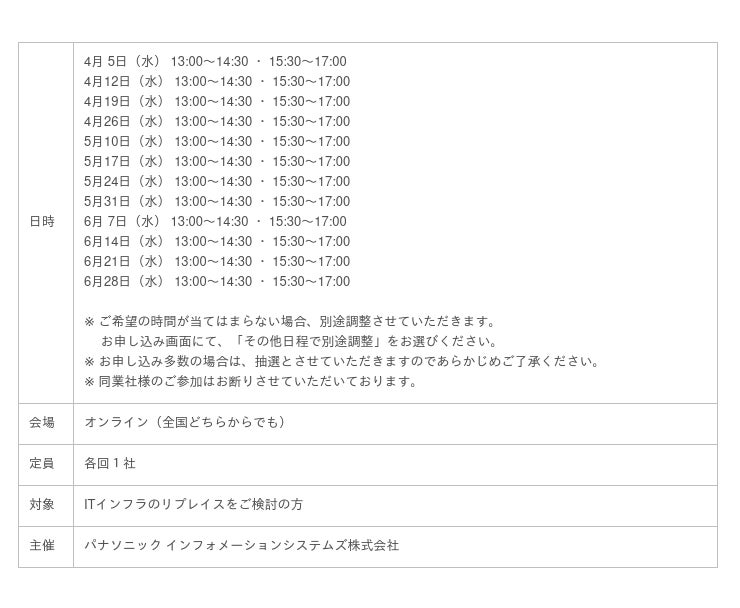 パナソニック インフォメーションシステムズ株式会社は、2023年4月5日(水)から2023年6月28日(水)にかけて、各回1社限定のHCIをはじめとするITインフラにフォーカスしたWeb個別相談会を開催します。