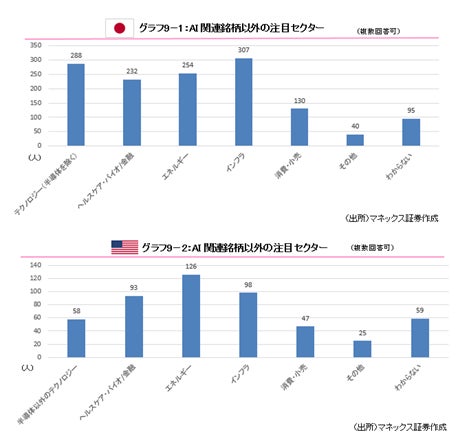 AI関連銘柄以外で注目しているセクターについてたずねました。日米共にAI関連に関する設問の回答結果(前出グラフ7-1、7-2)に一部重なるものの、日本の個人投資家ではインフラ関連、テクノロジー関連への注目度が高く、一方で米国の個人投資家はエネルギー関連セクターが最も高い結果となりました。