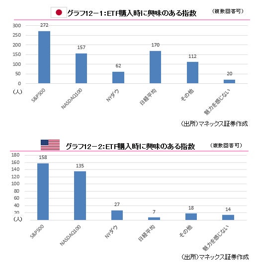 指数連動型ETFを検討する場合、どの指数に特に興味、あるいは魅力を感じるかについてたずねました。その結果、日米いずれの個人投資家においてもS&P500への注目度が最も高いことが確認されました。グローバル株式市場を代表する指数としての認知度の高さや、長期的な成長期待が背景にあると考えられます。また、日本の個人投資家では日経平均株価への注目度も高く、国内市場への親和性や分かりやすさが評価されている様子がうかがえます。