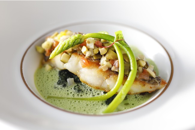 魚料理:玄界灘 天然マダイの白ワイン蒸し 八女茶のソース