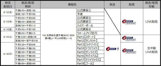 ■「FIA 世界耐久選手権(WEC) 2024 第4戦 ル・マン24時間レース」 放送/配信予定