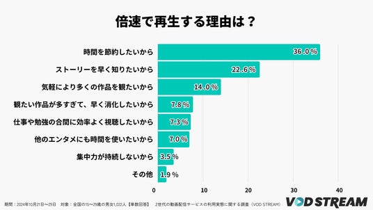 最後に、倍速で視聴すると回答した人にその理由をたずねたところ、「時間を節約したいから」が36.0%で最多。2番目は「ストーリーを早く知りたいから(22.6%)」、3番目は「気軽により多くの作品を観たいから(14.0%)」でした。