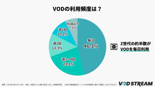 VODサービスを利用中の15~29歳の男女1,022人に、VODサービスの利用頻度を聞いたところ、46.3%が「毎日」と回答。「週3~4回(23.1%)」とあわせると、全体の69.4%が2日に1回以上、VODサービスを利用しているようです。
