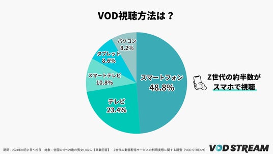 続いて、VODの視聴方法をたずねると、最多は「スマートフォン」で48.8%でした。Z世代の約2人に1人が、スマートフォンを用いてVODサービスを楽しんでいることが分かります。