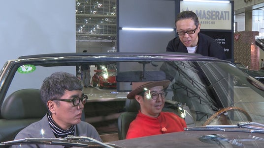 実は日本車ともなじみが深いジウジアーロ。ブースには、いすゞ ピアッツァの原型モデルになったコンセプトカー、アッソ・ディ・フィオーリも並ぶ。マツダのブースには、マツダ S8Pが鎮座。矢作兼は今のマツダ車との共通点を発見したようで、「今のマツダのデザインに近い!」と大興奮だ。スーパーカーブームを支えた1台も。それは、マセラティ ギブリ スパイダー。和田さんが「ジウジアーロがまだまだ若い頃だけど、かなり腕が上がってきた時の作品」と解説すると、小木がなぜか上から目線で論評。矢作からツッコミを受ける。