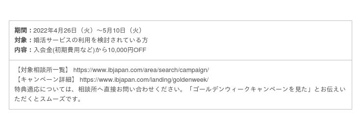 株式会社IBJ(代表取締役社長:石坂茂、東京都新宿区、東証プライム:6071)が運営する、日本一*の成婚数を誇る結婚相談所ネットワーク『日本結婚相談所連盟』は、2022年4月26日(火)~5月10日(火)の期間中、全国の加盟相談所と連携した『ゴールデンウィークキャンペーン』を実施します。