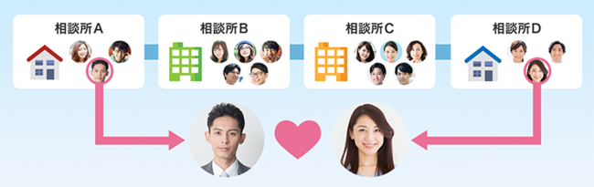 全国3,000社の結婚相談所と、75,000名の会員様をネットワークでつなぐ、国内最大*の結婚相談所ネットワークです。結婚相談所の開業支援も行っており、各地域に根差した結婚相談所網を広げることで、相互協力しながら成婚の幸せを生み出しています。