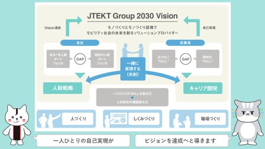 ジェイテクトは、「技術をつなぎ、地球と働くすべての人を笑顔にする」というミッションに基づき、2030年までに目指す姿としてJTEKT Group 2030 Vision「モノづくりとモノづくり設備でモビリティ社会の未来を創るソリューションプロバイダー」を掲げています。