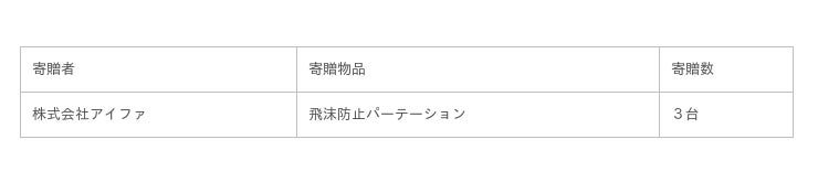 2020-07-04 東京都 飛沫防止パーテーションの寄贈について Tweet ~新型コロナウイルス感染症に関する東京都からのお知らせ~ この度、下記寄贈者から東京都に飛沫防止パーテーションの寄贈がありましたので、お知らせいたします。 [表: https://prtimes.jp/data/corp/52467/table/554_1.jpg ] 企業プレスリリース詳細へ PR TIMESトップへ 公式ツイッター Follow @Straightpress 最新情報をTwitterで受け取ろう! 公式フェイスブックページ 最新情報をFacebookで受け取ろう! 前の記事 一覧へ戻る 次の記事