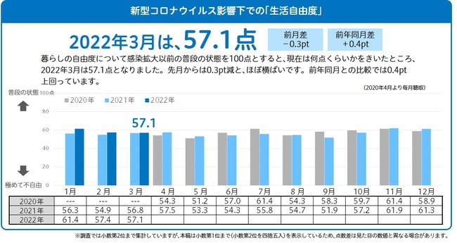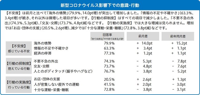【調査前の状況】2月初めに34県が対象だった「まん延防止等重点措置」は、中旬に山口県など一部で解除されたものの、首都圏・関西圏・中京圏を含む各都道府県では2度延長され3月21日まで継続。2月5日に1日10万人を超えた新規感染者数は、2月下旬に緩やかに減少を始めるも、3回目のワクチン接種率は2月末で対象者の約2割にとどまり、高齢者を中心に死者数も増加傾向をみせ、医療のひっ迫も続きました。月末にはロシアによるウクライナ侵攻の報道が始まり、そちらへの関心が高まる中での調査です。