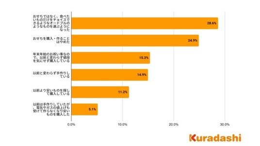 さらに、「ここ数年のあなたの家のおせちの変化について教えてください。」という設問に対し、食べたいものだけチョイスできるようなオードブルのようなものを選ぶようになったと回答した方が28.6%、おせちを購入・作ることはやめたと回答した方が24.9%、以前より安いものを探して購入しているという方が11.2%と、多くの方が節約を意識した購買行動へ変化していることが読み取れます。