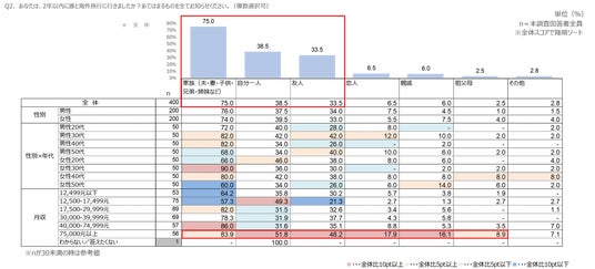 「75,000元以上」は他の層に比べて、多様な同行者と共に旅行する傾向が確認できる。これは旅行回数の多さ(Q1の回答傾向)に起因していると考えられる。