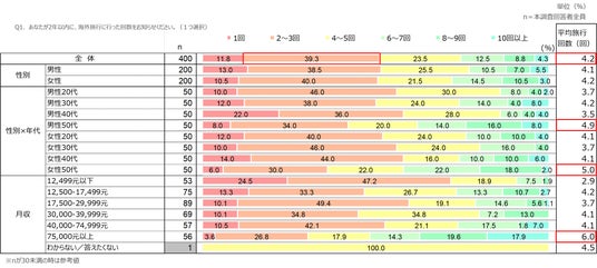 2年以内に海外旅行に行ったという人のうち、約9割が複数回、海外旅行に行っていた。また、「2~3回」が最も多く、全体の平均旅行回数は4.2回である。