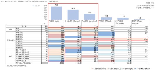 訪れたエリアでは「アジア州」が約7割半ばと人気が高く、その後は「ヨーロッパ州」「アメリカ州」と続く。
