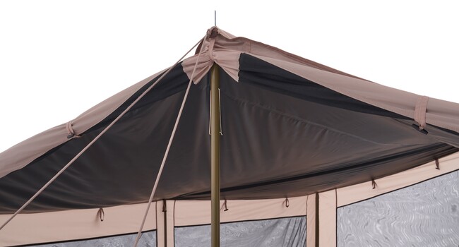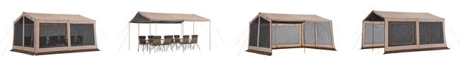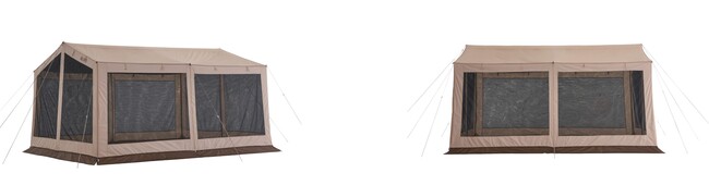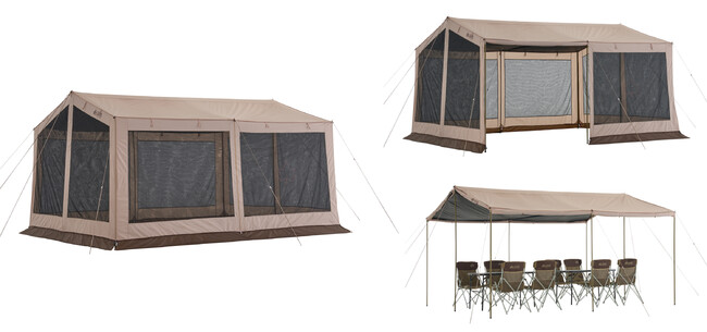 メッシュは巻き上げ可能で、巻き上げ方によっていろいろなアレンジが楽しめる。全面を巻き上げれば開放感のあるタープとなるほか、一部をオープン状態にすれば出入口を作ることもできる。
