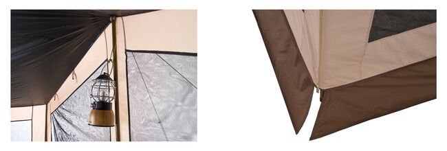 2本のポールにランタンを吊り下げられるフックを装備しているので、夜間の使用にも便利なほか、下部には冷気や雨などの浸入を防ぐマッドスカートを全面に装備したことで、より快適な空間を実現します。専用の収納バッグも付属しているので、持ち運びも簡単です。