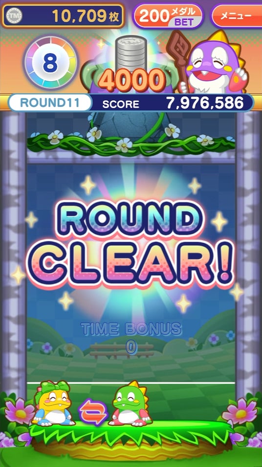 「パズルボブル グランパの宝の地図」は従来のバブルシューターの面白さに加えて、抽選結果でメダルが増減する仕組みを備えた新ジャンルのメダルゲームです。バブルを9個壊すごとに抽選が始まり、その結果に応じてメダルやパズルを有利に進める特殊バブルを獲得できます。「パズルボブル」シリーズならではの爽快感とスコアタックの楽しさ、メダル獲得のドキドキ感をお楽しみいただけます。さらに、便利な自動セーブ機能※があるので、タイクレの待ち時間にメダルゲームをプレイしていても途中で中断することが可能です。