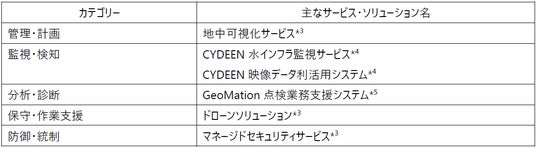 これまで個別に提供してきた多様な社会インフラ保守に関する「管理・計画」「監視・検知」「分析・診断」「保守・作業支援」、そして「防御・統制」に至るまでの既存のソリューション群を、お客さまの課題起点で横断的に組み合わせた提案が可能になります。お客さまの多様な課題に対応するため、以下のカテゴリーのソリューション群を提供します。