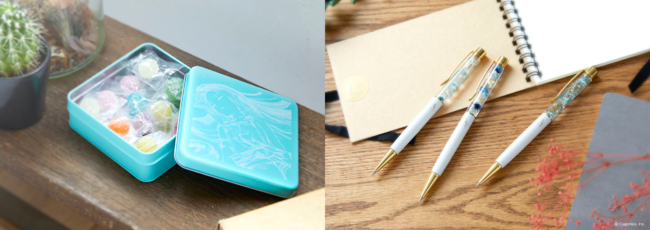 ▲(左から)蒼の追想 缶入りキャンディ / ハーバリウムボールペン(ルリア)