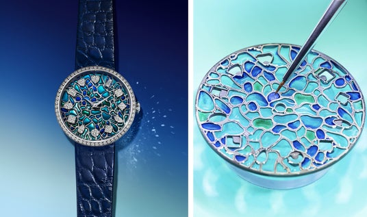 シグネチャーであるダイヤモンドがインデックスに用いられた「ティファニー エタニティ」コレクションの新作。鮮やかな色彩のエナメルの文字盤は、20世紀初期のティファニー スタジオで最も著名なデザインのひとつである「ウィステリア ランプ」のフローラル モチーフを再現しています。