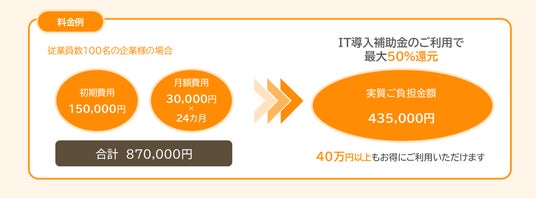 「IT導入補助金2025通常枠」において、補助金対象のITツールに認定されたことにより、補助金対象に認定された事業者様が「せきなび」を導入される場合、最大で導入費用の1/2(申請可能金額5万円以上150万円未満)の補助金が支給されます。
