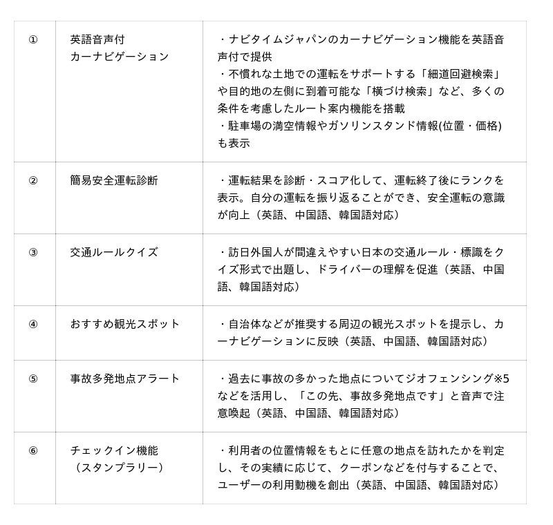 実証実験で使用していた英語音声付カーナビゲーション、安全運転診断、交通ルールクイズなどを軸に、事故削減や観光促進のための新たな機能の追加や改修を検討していきます。