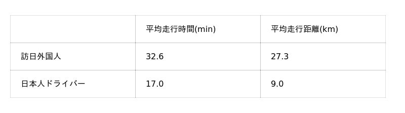 ・訪日外国人ドライバーは日本人ドライバーに比べて、1トリップあたりの走行時間・距離が長い傾向にあることが判明しました。