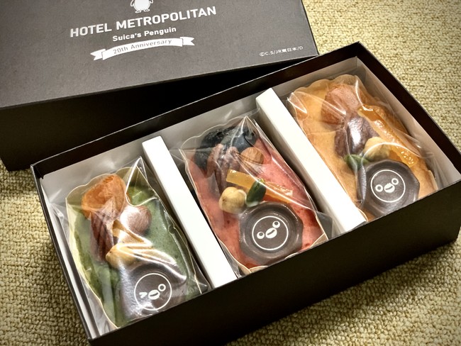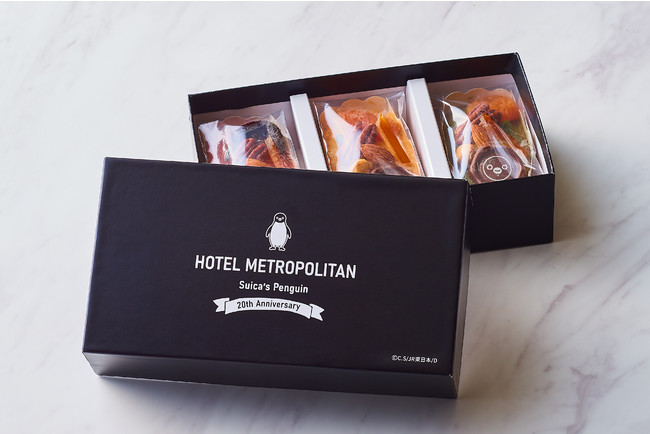 ホテルメトロポリタン(豊島区西池袋1-6-1 総支配人 伊藤茂夫)ではSuica20周年を記念したデザインボックスに詰められた3種のパウンドケーキを販売をいたします。ヘーゼルナッツを初めドライフルーツやそれぞれ違うお顔のSuicaのペンギンのチョコレートがトッピングされた賑やかなパンドーケーキです。
