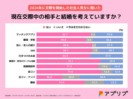 ・交際中の相手との結婚を考えている割合、「職場・学校」を「マッチングアプリ」が上回る