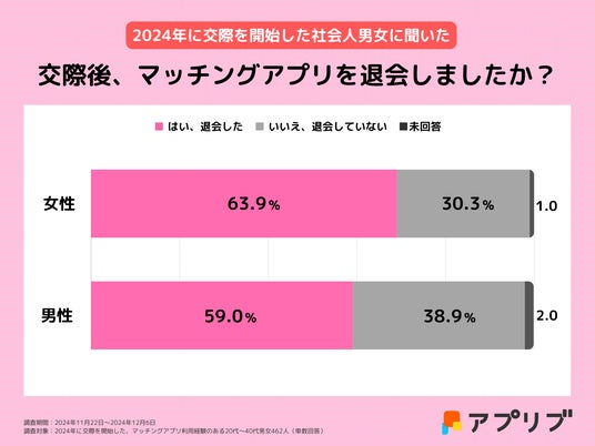 この結果を男女別で見てみたところ、交際後に退会していないと回答した割合は女性が30.3%に対し、男性が38.9%でした。交際後にマッチングアプリを退会していない割合は、男性のほうが女性より8.5ポイント上回る結果となっています。