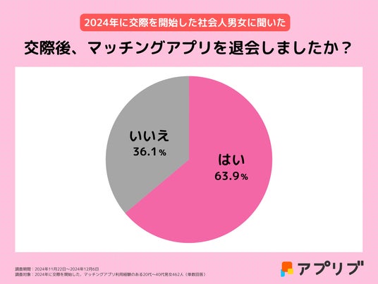 最後に、マッチングアプリを利用した経験がある462人に、交際を開始してからのマッチングアプリの退会状況について聞いてみました。その結果、「はい」が63.9%、「いいえ」が36.1 %と、全体の約4割は交際後もマッチングアプリを退会していないことがわかりました。
