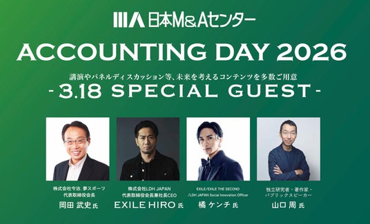 株式会社日本M&Aセンターホールディングス(本社:東京都千代田区 / 代表取締役社長:三宅 卓)の連結子会社である株式会社日本M&Aセンター(以下、日本M&Aセンター / 本社:東京都千代田区 / 代表取締役社長:竹内 直樹)は、2026年3月17日(火)・18日(水)にTOYOTA ARENA TOKYO(東京都江東区)で開催する会計事務所のための大規模イベント「ACCOUNTING DAY 2026~会計事務所のチカラで日本を元気に~」において、新たに3名のスペシャルゲストの登壇が決定しましたのでお知らせいたします。