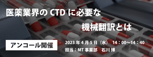 高精度AI自動翻訳の開発・運営を行う株式会社ロゼッタ(本社:東京都千代田区 代表取締役:渡邊 麻呂)は、無料ウェビナー『医薬業界のCTDに必要な機械翻訳とは』を2023年4月5日(水)に開催いたします。
