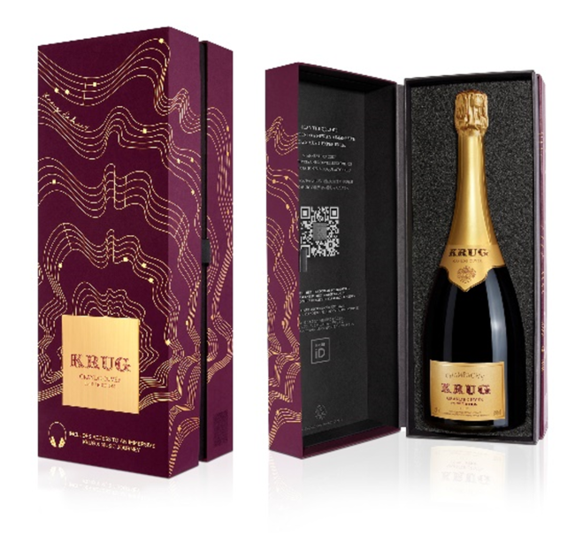内容:クリュッグのアイコンカラーであるダークチェリー色に楽譜模様をあしらった遊び心あふれるボックスには、QRコードが印刷されており、読み取ると、ご自宅でもクリュッグ グランド・キュヴェ 170 エディション誕生の物語を紐解きながら、ミュージックペアリングを体験いただけます。