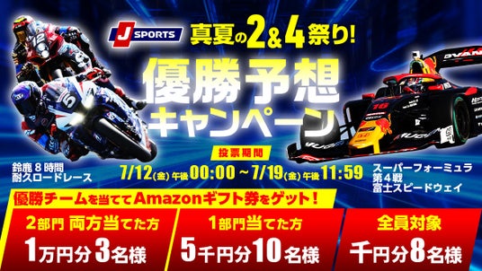 なお、7月20日(土)~21日(日)は、「鈴鹿8耐」のみならず、「スーパーフォーミュラ 第4戦」、「WRC世界ラリー選手権 第8戦」、「フォーミュラE世界選手権 第15-16戦」、「スーパーバイク世界選手権 第6戦」も生中継/LIVE配信します。圧倒的なボリュームでモータースポーツをお届けするこの週末を盛り上げるため、豪華景品が抽選で当たる鈴鹿8耐とスーパーフォーミュラの優勝予想キャンペーン「J SPORTS真夏の2&4祭り!」を開催します。