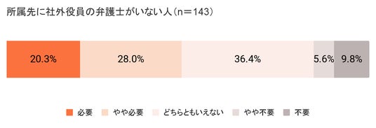 次に、社外役員における弁護士の必要性について、所属企業に社外役員の弁護士がいるかどうかで集計を行ったところ、社外役員の弁護士がいる企業では84.4%が「必要」と回答したのに対し、いない企業では48.3%にとどまりました。