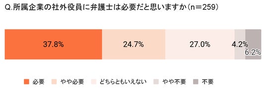法務パーソンに『所属企業の社外役員に弁護士が必要か』を尋ねたところ、62.5%が「必要」(「必要」「やや必要」の合計、以下同様)」と回答しました。