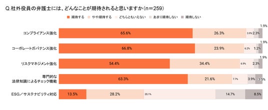 法務パーソンに『弁護士である社外役員に期待すること』を尋ねたところ、「期待する」(「期待する」と「やや期待する」の合計)が多かった内容は、「コンプライアンス強化」で91.9%でした。「コーポレートガバナンス強化」も90.7%とほぼ同数で続きました。