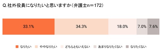 社外役員を経験したことがない弁護士172名に対して『社外役員になりたいか』を尋ねたところ、過半数の67.4%が「なりたい」(「なりたい」「ややなりたい」の合計)と回答しました。弁護士も社外役員に魅力を感じていることがうかがえます。