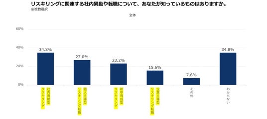 リスキリングに関連する社内異動や転職について、尋ねたところ1位「社内異動型リスキリング」(34.8%)、2位「個人主導型リスキリング転職」(27.0%)、3位「新卒育成型リスキリング」(23.2%)の順番で世の中に認知されていることが明らかになりました。