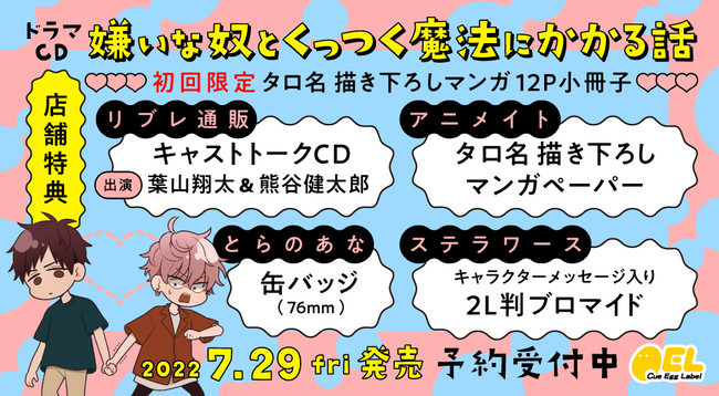 株式会社リブレ(本社:東京都新宿区、代表取締役社長:太田歳子)は、ドラマCD「嫌いな奴とくっつく魔法にかかる話」のキャストインタビューと、描き下ろし小冊子の詳細を公開いたしました。