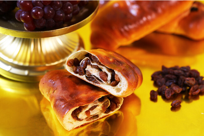 生地量に対して100%(生地と同量)のラム酒漬けのレーズンを詰め込んだ口いっぱいにぶどう100%の衝撃が広がるぶどうパンです。優しい味わいのパン生地にたっぷりレーズンが入ったぶどうパンは、ほんのり香るラム酒の風味とレーズンの甘みが口いっぱいに広がり、まるでぶどうをそのまま食べているかのような味わい。口いっぱいに頬張って、レーズンの旨味が広がる味わいをどうぞお楽しみください。