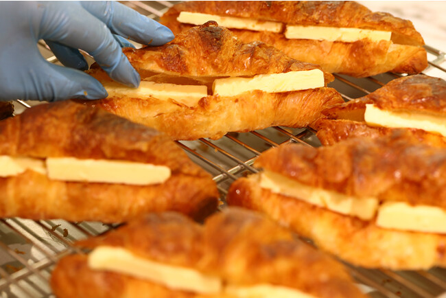 また、本来クロワッサンにはバターがたっぷり含まれているのに物足りなさを感じる人が多かったので、だったら生地にさらに練り込み、バターを表面に塗って、とどめにバターを丸ごと挟んでしまおう!と試みました。スタッフでさえ「これはヤバい!」と言ってたのを見て「よし!」と思いました。今までになかった見た目とベストな配合を生み出すために約1ヶ月間、何度も何度も試作を重ねました。