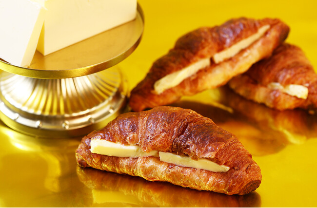 「もっとバターの旨味をガッツリ堪能したい!」そんなバター好きな方のリクエストにお応えいたしました。生地量に対してなんと驚きの56%、製品1個に30g(ホテルバター3.7個分)のバターを使用したクロワッサンです。発酵バターを折り込んだクロワッサンに溶かしバターを塗り、さらにダメ押しで仕上げにバターをサンドした3度バターな商品。噛む度に発酵バターの風味とコクが広がりまるでバターをそのまま食べているかのような味わいをお楽しみいただけます。きっとあなたもあふれ出るバターの海に溺れてしまう!