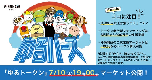 株式会社フィナンシェ(代表取締役:國光 宏尚、以下フィナンシェ)は、ゆるキャラグランプリ実行委員会と株式会社スマートリレーション(代表取締役:佐野 気理)が協業する「ゆるトークン」プロジェクトが本日7月10日19時より、FiNANCiEにてデジタルアイテム「トークン」の二次流通マーケットを公開しますことを知らせいたします。