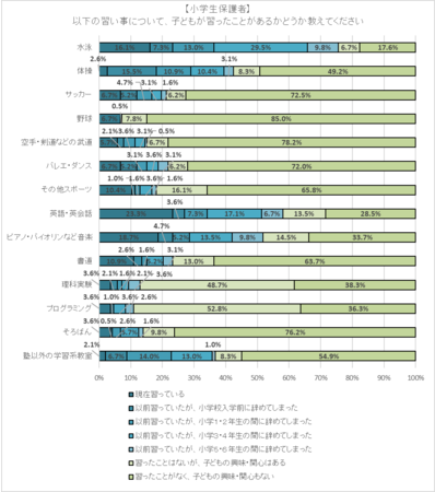 次に、「習い事を習ったことがある」と回答した保護者に、以下の習い事についての経験を聞いた。