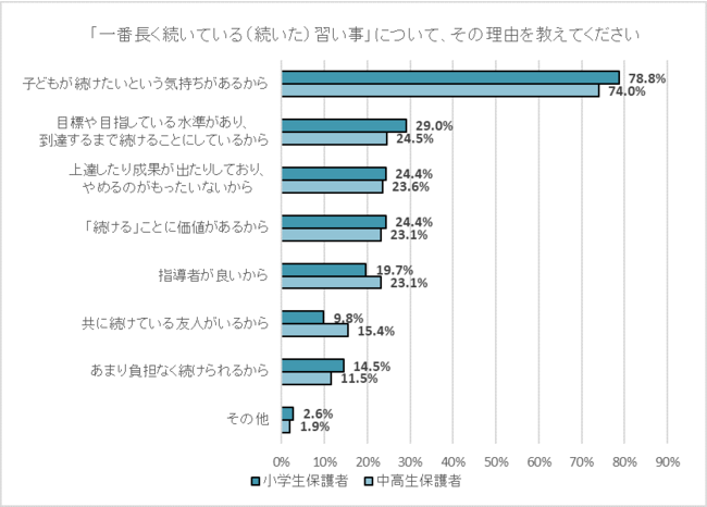 「習い事を習ったことがある」と回答した保護者に、「一番長く続いている、もしくは続いた習い事」について、その理由を聞いた。